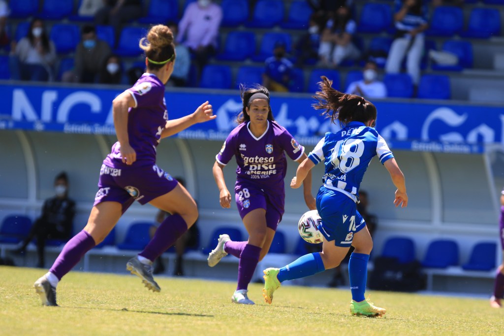 En la recta final del primer periodo, el Deportivo Abanca empezó a tener muchas dudas en la circulación de balón ante un combinado insular que se fue haciendo con el control del esférico en la línea medular y sometió a las pupilas de Manu Sánchez. En el minuto 35 Raquel Peña Rodríguez ‘Pisco’ lanzó un córner muy cerrado que se fue envenenado y se quedó a centímetros de convertirse en gol olímpico de no ser por la intervención de Esther Sullastres.