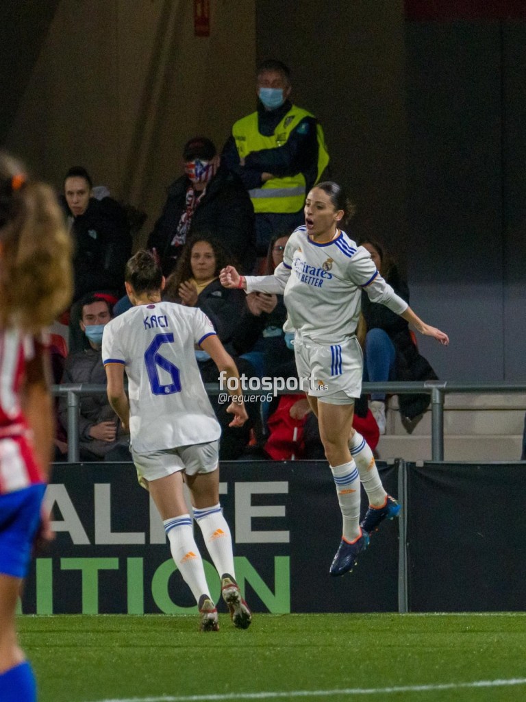 El transcurso de los minutos propició que el Atlético de Madrid se hiciera con el control del esférico en la línea medular ante un Real Madrid que optó por defender en bloque alto e intentar acto seguido hilvanar acciones al contragolpe, un planteamiento que se mantuvo vigente hasta alcanzar el primer cuarto de hora, lapso temporal en el que las colchoneras reclamaron un posible penalti sobre Ajibade que la colegiada Olatz Rivera Olmedo interpretó como una carga legal y a partir de ahí, el conjunto merengue reaccionó y subió el ritmo, algo que le daría frutos. Corría el minuto 28 de un derbi con claro color rojiblanco cuando un centro de Athenea desde la banda izquierda voló hacia el interior del área y encontró la cabeza de la noruega Caroline Møller Hansen que se anticipó a su marca y conectó un potente frentazo que superó a Lola Gallardo y sirvió para abrir la lata al firmar el 0-1 en el electrónico y hacer así saltar la sorpresa en el Centro Deportivo Wanda Alcalá de Henares.