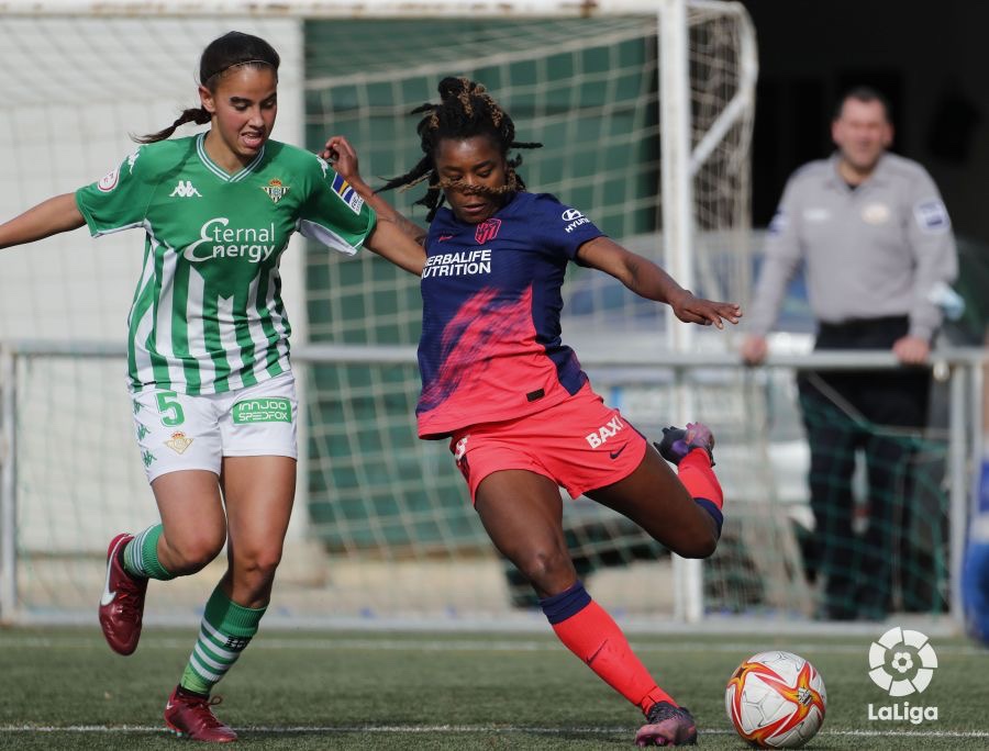 El partido fue disminuyendo en intensidad, siendo entonces el Atlético el que tenía mayor posesión de balón y los últimos minutos del primer acto transcurrieron con cambios continuos en el dominio del esférico, sin ocasiones claras en ninguna de las dos áreas aunque Grace Asantewaa lo intentó al final desde la frontal, pero su disparo fue muy centrado y fue a parad a las manos de Lola Gallardo, que había evitado con anterioridad que las béticas ampliasen su renta.