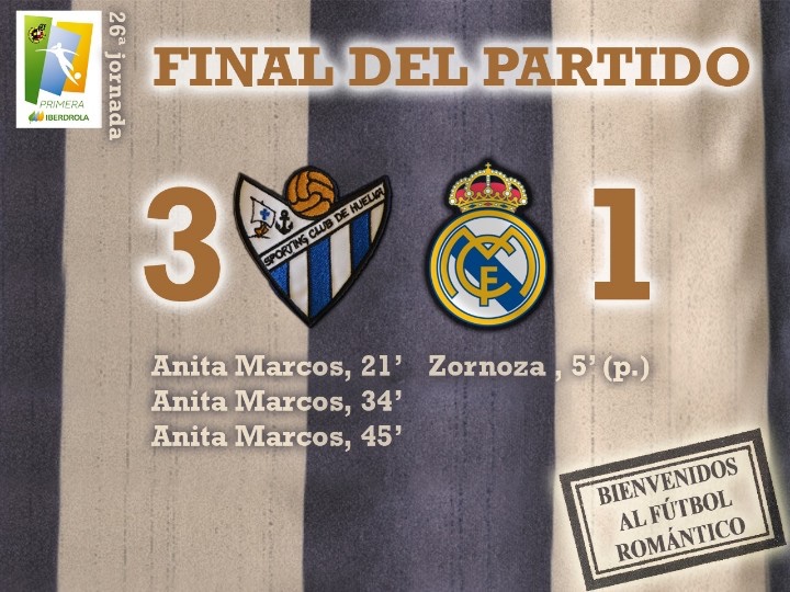 Justo antes del final del primer tiempo, la goleadora Anita Marcos realizó una gran acción individual y después dé marcharse de Rocio Gálvez por velocidad, le propinó un beso envenenado al cuero que superó a Misa y el 3-1, que a la postre resultó ser definitivo, se instauró el luminoso en el minuto 45 y el hat-trick de la andaluza terminó de echar por tierra las esperanzas de las madrileñas.