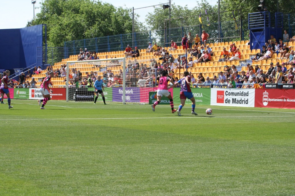 Patri Ojeda evitó en el minuto 16 un mano a mano de Aitana Bonmatí con Emily Dolan enviando la pelota a córner y acto seguido, las espartanas tuvieron la oportunidad de adelantarse en el marcador en un centro de Fatou Kanteh desde la derecha que cabeceó Anita Marcos al palo y que no entró por muy poco en la portería de Sandra Paños. El testarazo de la exjugadora del Atlético de Madrid no lo aprovechó Hannah Keane, que disparó fuera para malograr una ocasión de oro para las onubenses.