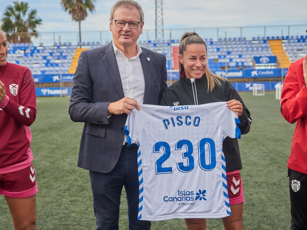 Pisco es la tercera máxima goleadora del conjunto tinerfeño en la élite y este jueves, 8 de de diciembre de 2023 coincidiendo con la realización de la foto oficial de plantilla para la presente campaña, y la mano del presidente de la entidad Sergio Batista y sus compañeras de vestuario, la lateral recibió una camiseta que conmemora sus 230 encuentros, un justo reconocimiento a su profesionalidad, dedicación y amor por los colores del Granadilla Tenerife. Orgullo azul y blanco.