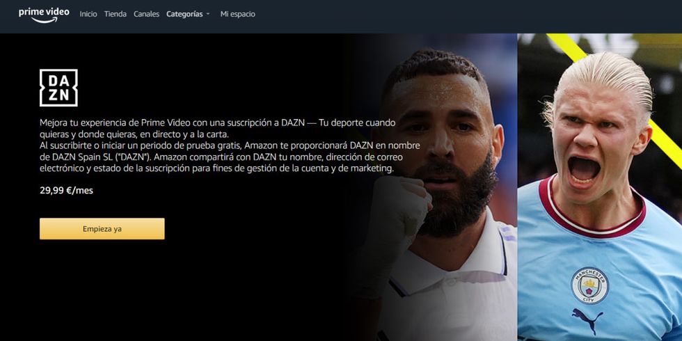 DAZN se unirá a la extensa lista de canales de Prime Video que en España incluye LaLiga SmartBank, FlixOlé, MGM, AContra+, Noggin, Hayu, PLANET HORROR, MUBI, Acorn TV, Qello Concerts, OUTtv, TV Cortos, Stingray Karaoke, DJAZZ, Mezzo, Hopster Learning, Vaughanplay.tv, Stingray Classica, Dizi o Pash, entre otros, y a nivel internacional marcas como HBO Max, Discovery, Paramount+ o Showtime.