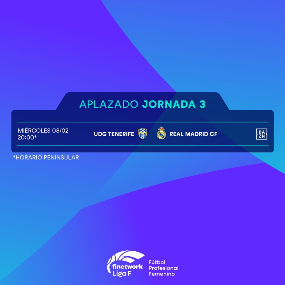 La Primera División Femenina que preside Beatriz Álvarez Mesa postergó el compromiso entre el Granadilla Tenerife y el Real Madrid, programado para ese domingo a las 21:00 horas en La Palmera.