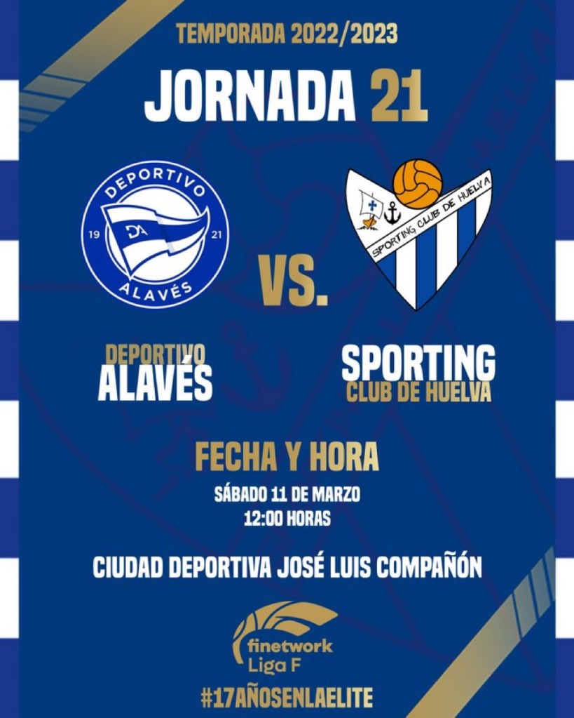 La 21ª jornadas de la Finetwork Liga F 2022-2023 habrá de alzar el telón con un partido de la zona baja que enfrentará al Deportivo Alavés Gloriosas y el Sporting Club de Huelva, a partir de las 12:00 horario peninsular, el próximo 10 de marzo de 2023 en Ibaia.