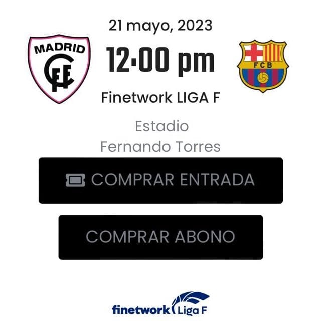 El Madrid Club de Fútbol Femenino, actual quinto clasificado de la LPFF 2022/2023, ha anunciado, a través de su página web (https://madridcff.com/), que ya ha habilitado una sección de la misma en la que se pueden comprar las entradas para este duelo a un precio unitario de 11,32 euros.