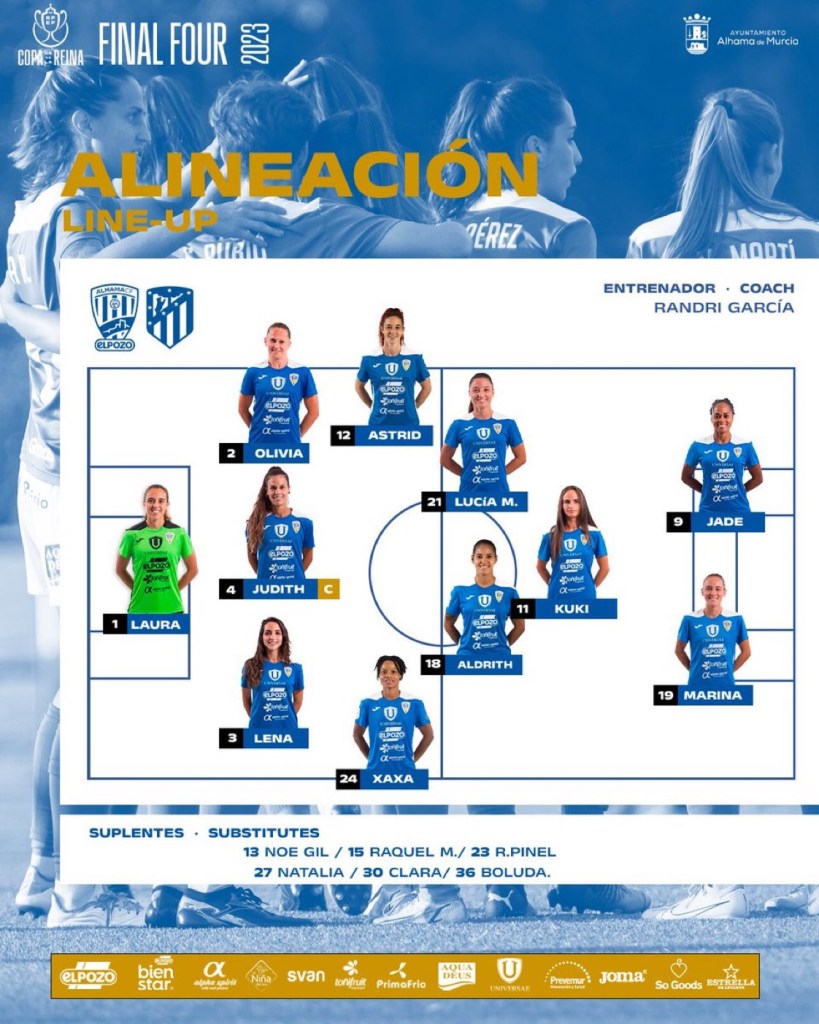 Alhama ElPozo: Laura, Olivia, Lena, Judith, Jade (Boluda,90′), Astrid (Pinel, 68′), Kuki (Clara, 81′), Aldrith, Marina, Lucía M. y Xaxa (Natalia, 90′)
