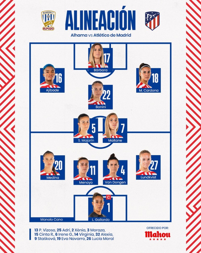 Atlético de Madrid: Lola Gallardo. Merel, Majarín, Maitane (Irene, 46′) , Menayo, Ajibade (Eva, 46′), Bárbara (Lucía Moral, 72′), Cardona (Moraza, 67′), Medina, Banini y Lundkvist.