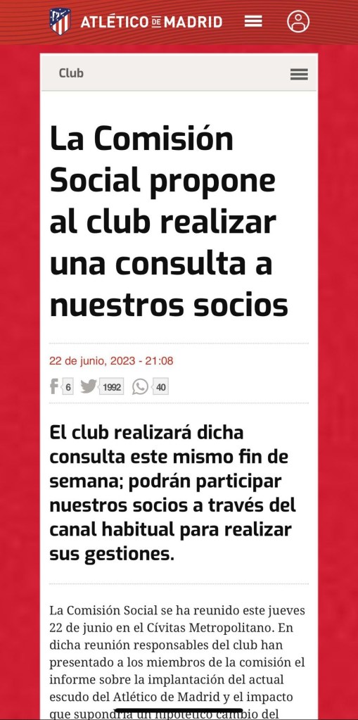 El Atlético ha emitido esta tarde un comunicado que dice lo siguiente: “La Comisión Social se ha reunido este jueves 22 de junio en el Cívitas Metropolitano. En dicha reunión responsables del club han presentado a los miembros de la comisión el informe sobre la implantación del actual escudo del Atlético de Madrid y el impacto que supondría un hipotético cambio del mismo. El informe ha sido elaborado con datos de Nielsen, Deloitte Football Money League, Football Benchmark, LaLiga y datos de la auditoría interna. De esta manera el club ha cumplido el compromiso que asumió ante la comisión de presentar dicho informe una vez finalizada la temporada 22-23. Después de la exposición del contenido del informe, los miembros de la comisión han propuesto realizar una consulta de manera inmediata a los socios del Atlético de Madrid sobre la conveniencia o no de volver al escudo anterior, que los responsables del club se han comprometido a llevar a cabo este mismo fin de semana. Por tanto, mañana, viernes 23 de junio, los socios del Atlético de Madrid recibirán un correo electrónico con los detalles de cómo participar en dicha consulta, que se hará a través del canal habitual por el que ya realizan cualquier gestión durante todo el año (canjear el bono regalo, ceder el abono, solicitar entradas, cambiar los datos de contacto…), conectándose cada socio de manera individual con sus credenciales habituales. Este sistema es seguro, fiable y ya es ampliamente conocido y utilizado por nuestros socios a diario para realizar sus gestiones. En esta consulta podrán participar exclusivamente los socios del Atlético de Madrid. La participación estará abierta de manera ininterrumpida durante este fin de semana, desde el sábado 24 de junio a las 10:00 horas hasta el domingo 25 de junio a las 18:00 horas.Un notario dejará debida constancia tanto del procedimiento empleado para realizar esta consulta como de los resultados de la misma. Una vez finalizada la consulta, el club analizará los resultados en profundidad para valorar la situación con rigor, cuantificar cuántos socios desean volver al escudo anterior y, posteriormente, tomará las decisiones que correspondan”.