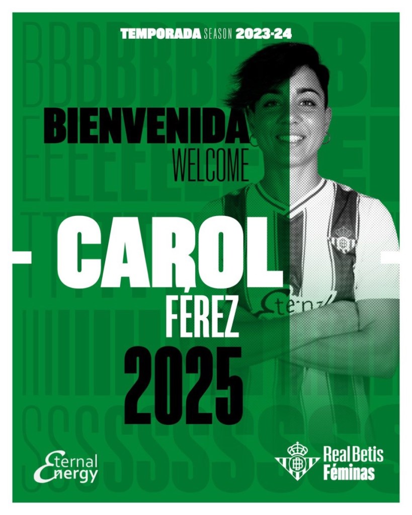 El Real Betis Balompié Féminas, duodécimo clasificado de la Liga F 2022/2023, ha notificado a través de su página web oficial, (https://www.realbetisbalompie.es/feminas/portada/), que ha sido capaz de alcanzar un acuerdo en firme con Carolina Férez Méndez para que ésta se incorpore a la disciplina de las de Heliópolis.