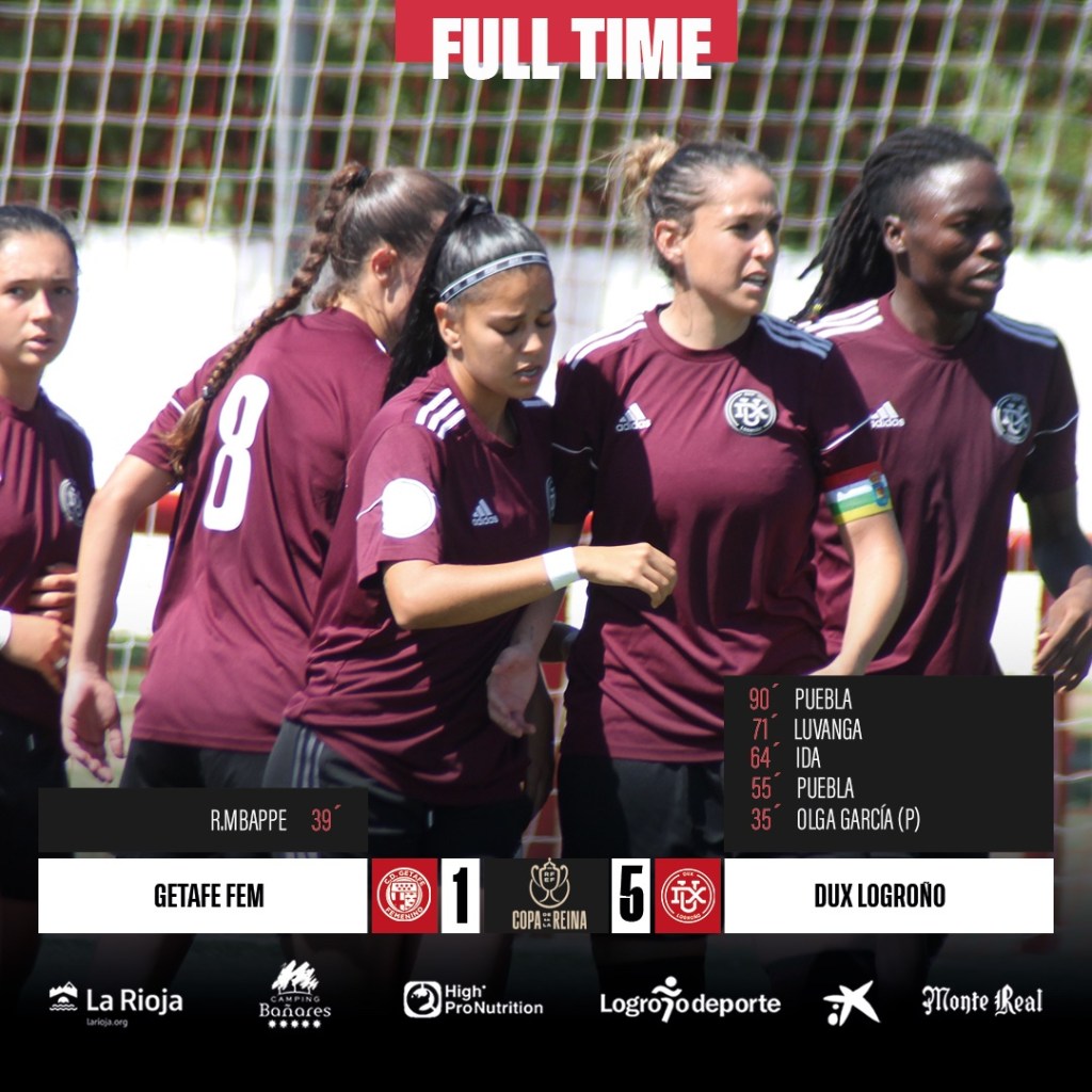 Ya con todo visto para sentencia en favor de las riojanas, el Getafe dio un bajón físico muy notable, emergió la calidad de la joven Saray López que le entregó el balón en una muy buena posición a su compañera, Marina Puebla para que ésta cerrase la goleada al establecer el definitivo 1–5 cuando el reloj deambulaba por el minuto 90 de una eliminatoria que no dio más de sí en Madrid.