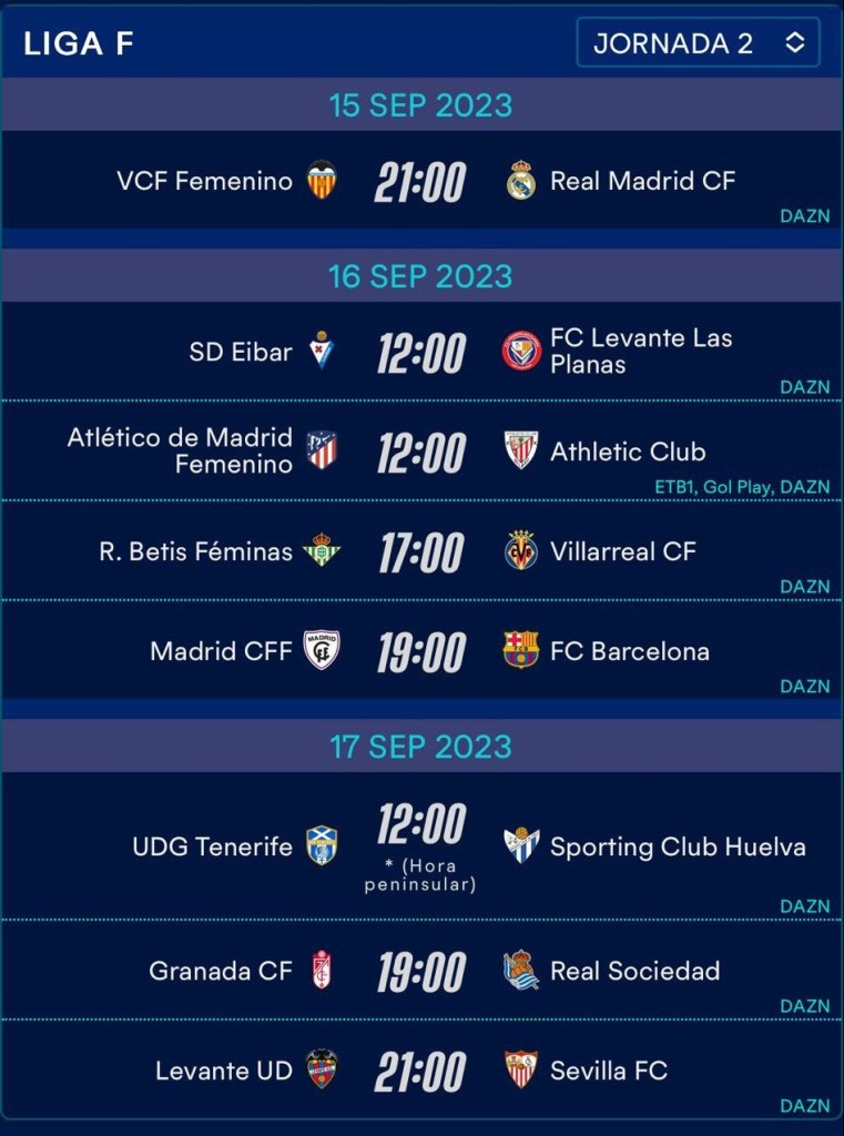 Muestra los encuentros que se disputarán en la temporada 2023-2024 de la Liga F, junto a los días y horarios. Si se desea adquirir mayor información de cada equipo, cuenta con una división de conjuntos en las que se informa las altas y bajas, las novedades, se analiza las estadísticas, se informan los resultados y se brindan los datos institucionales de cada club que forma parte de la élite del balompié femenino español.
