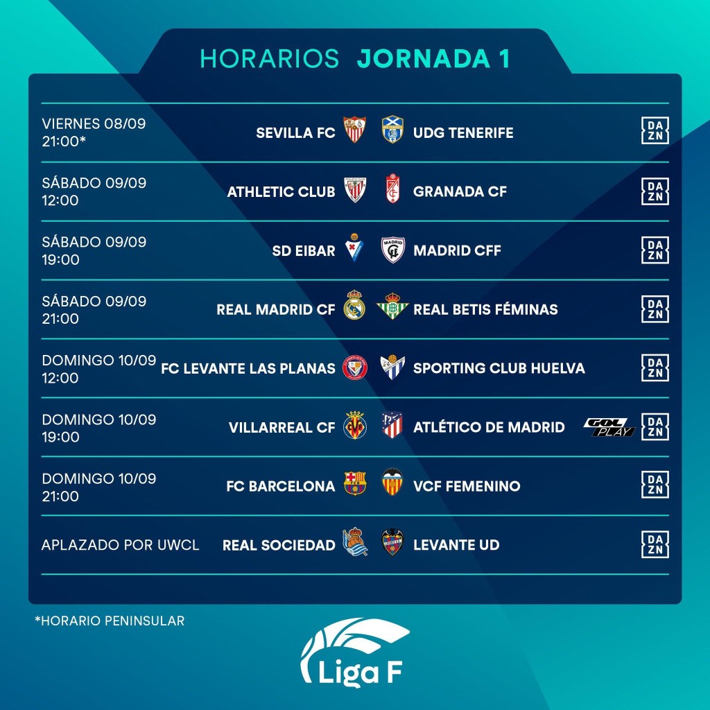 La nueva temporada de la Liga F se estrenará, por tanto, este viernes a las 21:00 con la disputa del duelo que enfrente a Valencia y Real Madrid en el Antonio Puchades. El sábado se disputarán cuatro encuentros (Eibar-Levante Las Planas; Atlético de Madrid-Athletic Club; Betis-Villarreal; Madrid CFF-Barcelona) y el domingo se cerrará la jornada con otros tres (UDG Tenerife-Sporting de Huelva; Granada-Real Sociedad; Levante-Sevilla).
