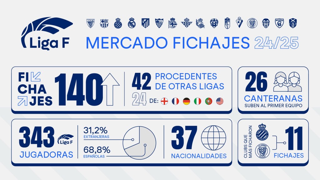 El pasado lunes 16 de septiembre concluyó el mercado de fichajes de la temporada 2024/2025 en Liga F, que contará con 343 jugadoras con licencia de las que 107, el 31.2% son extranjeras, extranjeras, procedentes de 37 nacionalidades diferentes, frente a 236 españolas, lo que supone el 68.8% de las futbolistas inscritas.