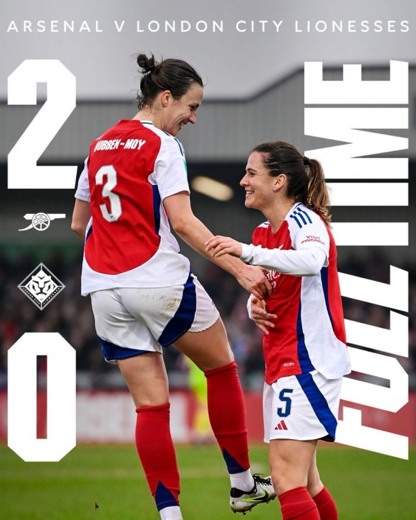 Arsenal: 1.Zinsberger, 3.Wobben-Moy, 5.Codina, 8.Mariona, 11.Mccabe, 12.Maanum, 19.Foord (Blackstenius, 71’), 22.Nighswonger (Walti 45’), 23.Russo, 32.Cooney-Cross (Ilstedt, 88’), 62.Reid