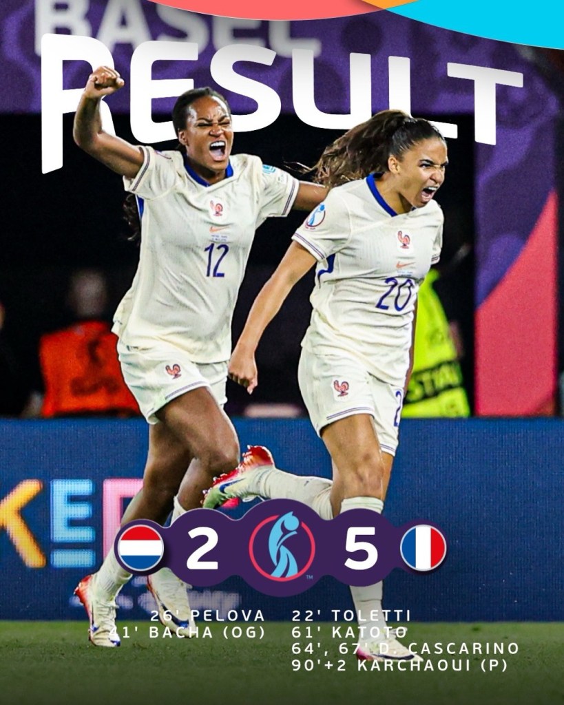 La selección de Francia mostró su contundencia en la última jornada del Grupo D para imponerse a Países Bajos en la EURO Femenina de la UEFA 2025. Delphine Cascarino fue clave con un doblete y asistencia .