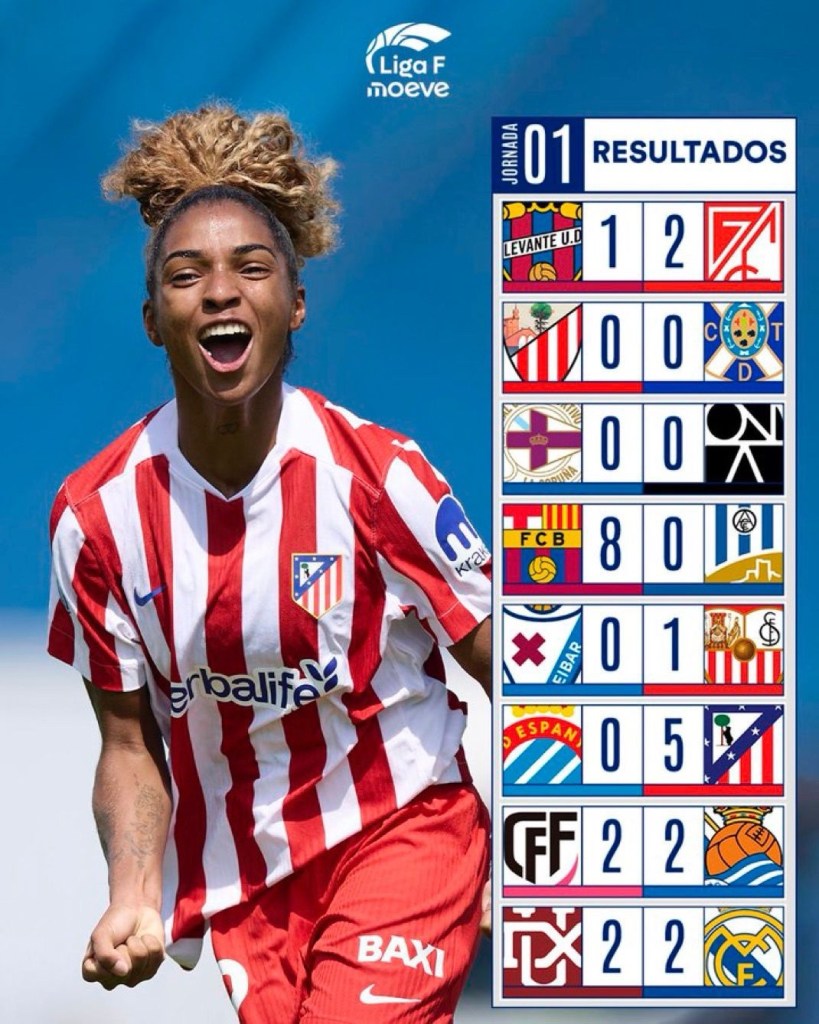 Apenas La temporada 2025/2026 de Liga F Moeve arrancó este fin de semana con mucha igualdad en los ocho encuentros. La jornada 1 se abrió el sábado 30 de agosto a las 12:00 horas con el Athletic Club 0 – Costa Adeje Tenerife 0. A la misma hora se disputó el Levante UD 1 – Granada CF 2. Por su parte, a las 18:00 horas fue el turno del Deportivo Abanca 0 – FC Badalona Women 0 y a las 20:00 horas se disputó el FC Barcelona 8 – Alhama CF ElPozo 0. Ya el domingo 31 de agosto se jugaron dos encuentros a las 12:00 horas, el duelo entre SD Eibar 0 – Sevilla FC 1 y el RCD Espanyol 0 – Atlético de Madrid 5. Por la tarde se disputaron el Madrid CFF 2 – Real Sociedad 2 a las 18:00 horas y el DUX Logroño 2 – Real Madrid CF 2 a las 20:00 horas. Todos los encuentros se pudieron ver por DAZN, mientras que el duelo entre el cuadro perico y el rojiblanco también se emitió por Gol Play y TEN.