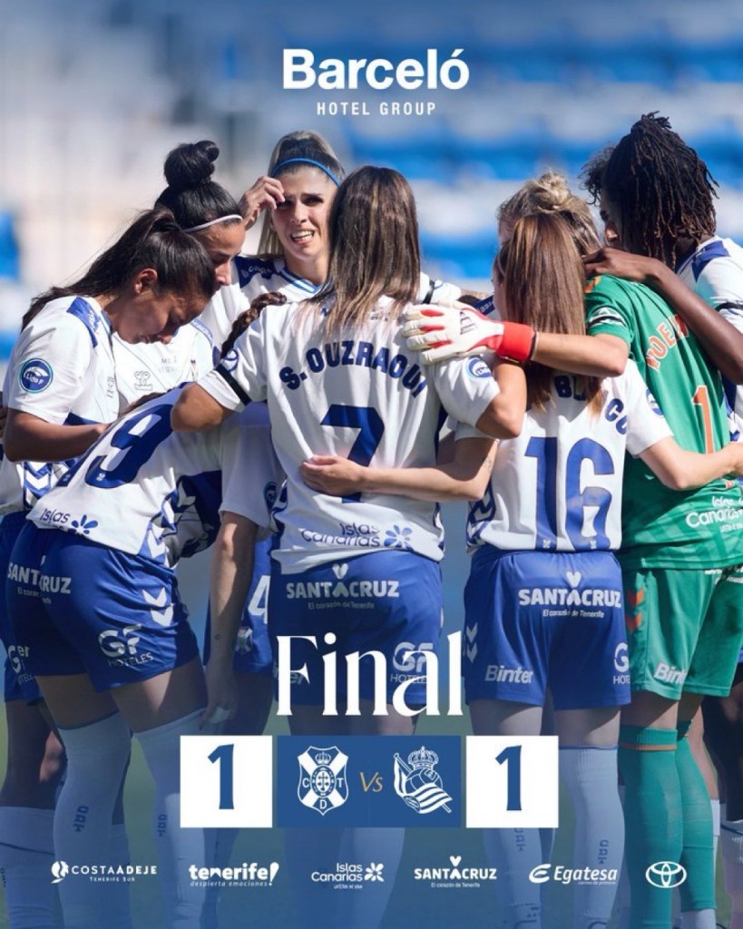 El Costa Adeje Tenerife Egatesa firmó así un empate intenso ante un rival directo, dejando buenas sensaciones por la actitud, el juego y la competitividad mostrada a lo largo de los 96 minutos de partido. El Heliodoro vibró con cada acción, celebrando el gol de Iratxe y la entrega de las blanquiazules hasta el último instante, próxima estación viajar a Fuenlabrada para jugar los cuartos de final de la Copa de la Reina frente al Madrid CFF y en deje mismo torneo , que es muy bello , la Real Sociedad se medirá al ONA en Zubieta.