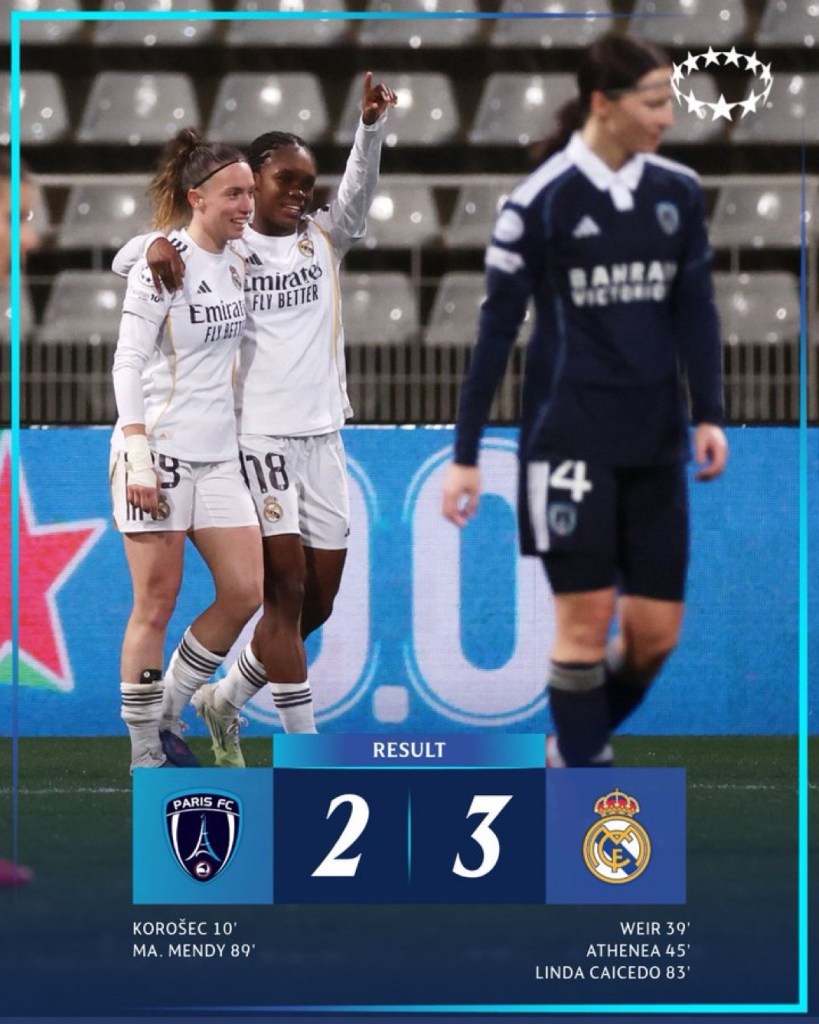 ◼️ El conjunto blanco se impuso por 2-3 al París FC fuera de casa en la ida de los playoffs que dan acceso a los cuartos de la Champions. Caroline Weir, Athenea del Castillo y Linda Caicedo marcaron los tantos del Real Madrid CF, mientras que, Kaja Korosec y Maeline Mendy anotaron los goles del equipo francés.