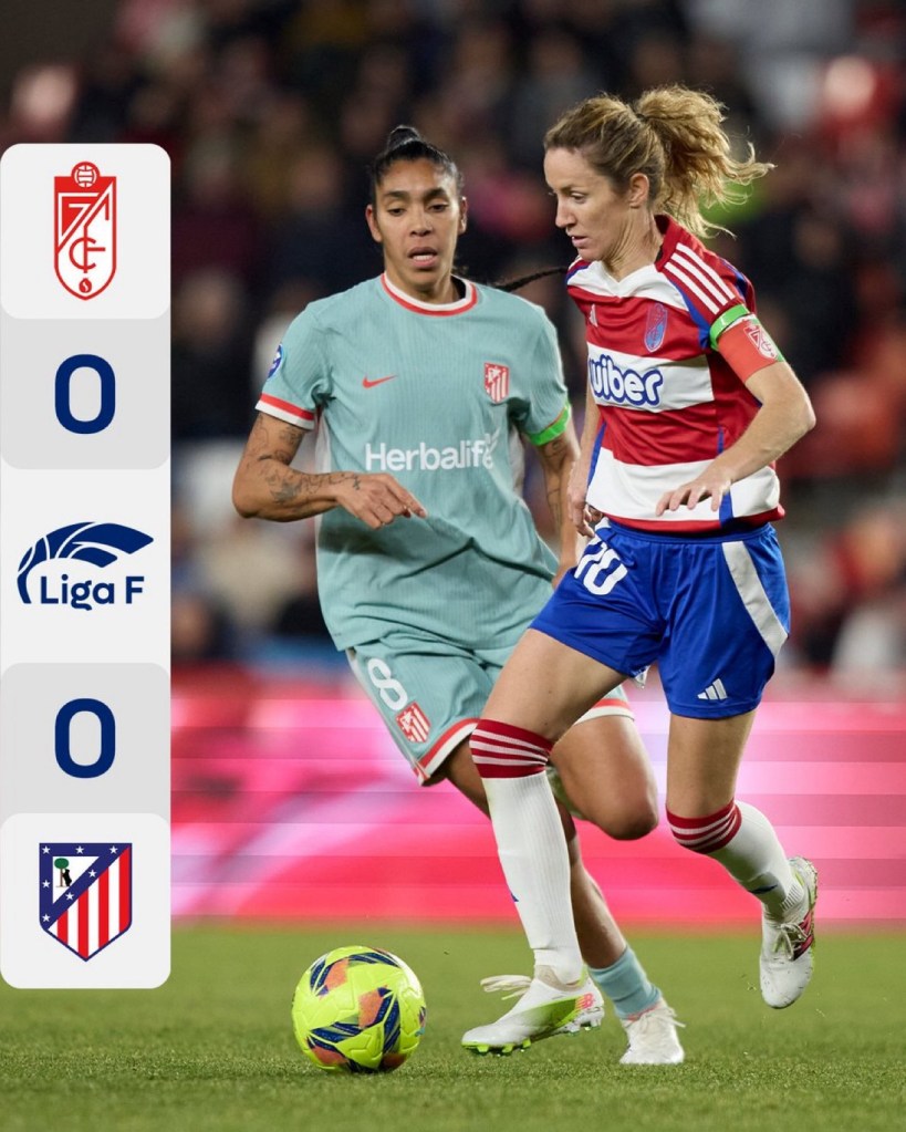 El estadio Nuevo Los Cármenes fue el escenario del encuentro que cerró la jornada 17 de Liga F. En la previa, Laura Pérez recibió una camiseta conmemorativa por sus 250 partidos como granadinista. Boe Risa tuvo la primera gran ocasión del encuentro, pero Sandra Estévez logró desviar su disparo y mandar la pelota a saque de esquina. La guardameta local también se mantuvo muy segura en la segunda mitad atrapando un chut de Moraza y un buen acercamiento de Gio Queiroz. El tramo final del choque fue para el conjunto nazarí, que se volcó hacia la portería defendida por Patri Larqué, que fue la MVP del partido. La ex del Rayo Vallecano evitó el gol de Ornella Vignola, blocó un potente testarazo de Jujuba, y con ayuda del palo, rechazó un disparo de Ariadna Mingueza. Con este empate, el Atlético de Madrid se queda en la 4ª posición con 30 puntos, a dos de Europa.