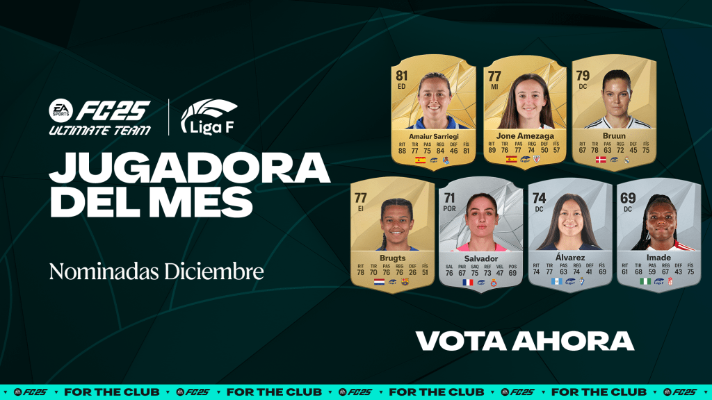 Liga F fue elegida por EA SPORTS para convertirse en la primera liga femenina en estrenar la elección de la jugadora del mes: ‘Player of the month’. La marca de videojuegos arrancó durante el mes de septiembre esta pionera campaña en el fútbol femenino mundial. La galardonada a mejor jugadora del mes del primer mes de competición fue Rasheedat Ajibade. A la atacante nigeriana se le unieron las azulgranas Alexia Putellas, como ganadora del mes de octubre, y Patri Guijarro, que recibió el premio en el mes de noviembre. Las votaciones de diciembre se vuelven a abrir hasta el domingo.