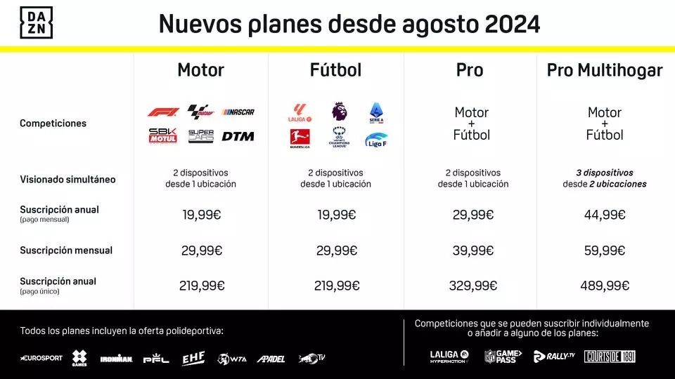 Los nuevos suscriptores de DAZN podrán elegir entre cuatro planes diferentes, que mantienen su precio más económico desde 19,99 euros/mes. Cada uno de ellos con distintas modalidades de pago (anual, anual fraccionado en 12 cuotas o mensual) para que cada usuario decida si prefiere primar la flexibilidad o el ahorro, y elija de manera sencilla la oferta que mejor se ajusta a sus intereses.