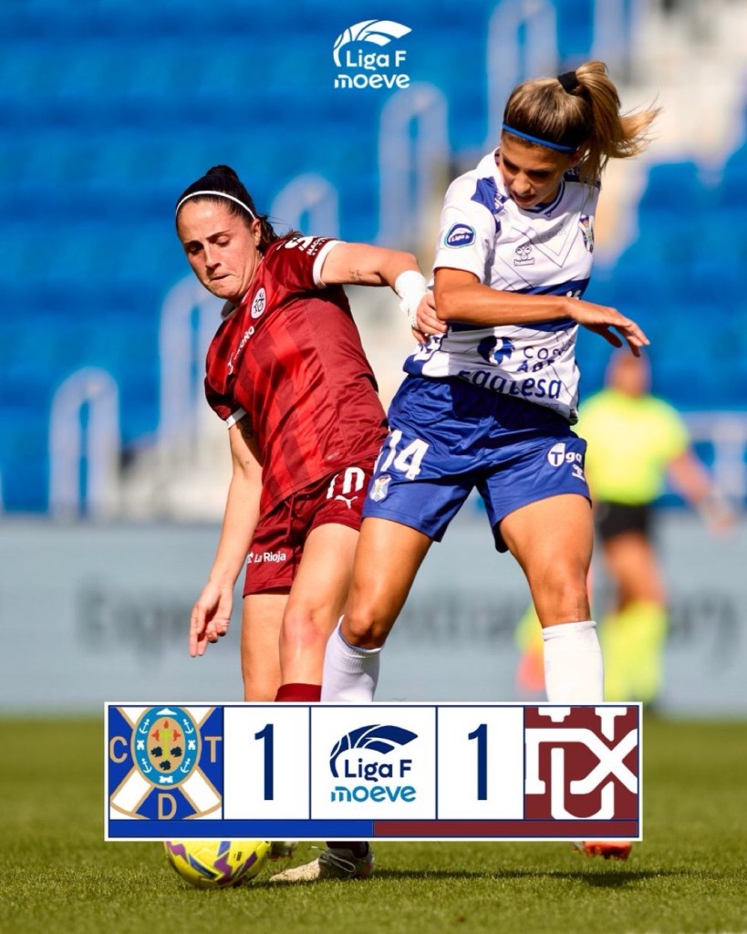 🟨 Reparto de puntos en el Heliodoro (1-1). Natalia Ramos, que fue la MVP del encuentro, abrió el marcador para el Costa Adeje Tenerife con un golazo en la primera mitad. Paula Rubio anotó en el segundo tiempo para que el DUX Logroño sacara un punto de oro para colocarse a únicamente tres puntos de la salvación.