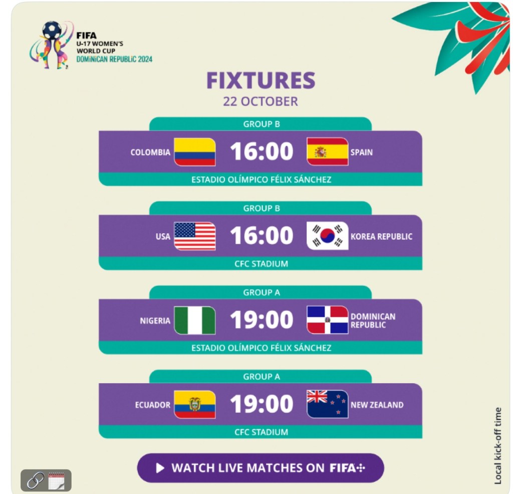 Partido correspondiente a los cuartos de final del Mundial Femenino sub 17 que enfrentaba a las selecciones de España y Ecuador , disputado en el Estadio Olímpico Félix Sánchez (República Dominicana). El partido pudo seguirse por RTVE y FIFA TV Plus.