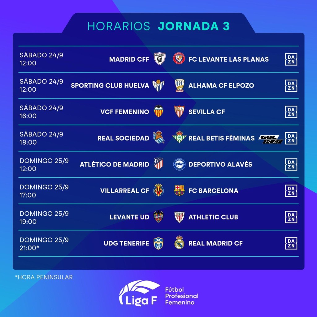 Además, el grupo audiovisual Mediapro aportará cobertura a un partido en abierto cada fecha y en esta ocasión la parrilla televisiva de la tercera jornada, que en realidad es la segunda al no haberse celebrado la primera por la “huelga” de las colegiadas, será la que vemos a continuación: