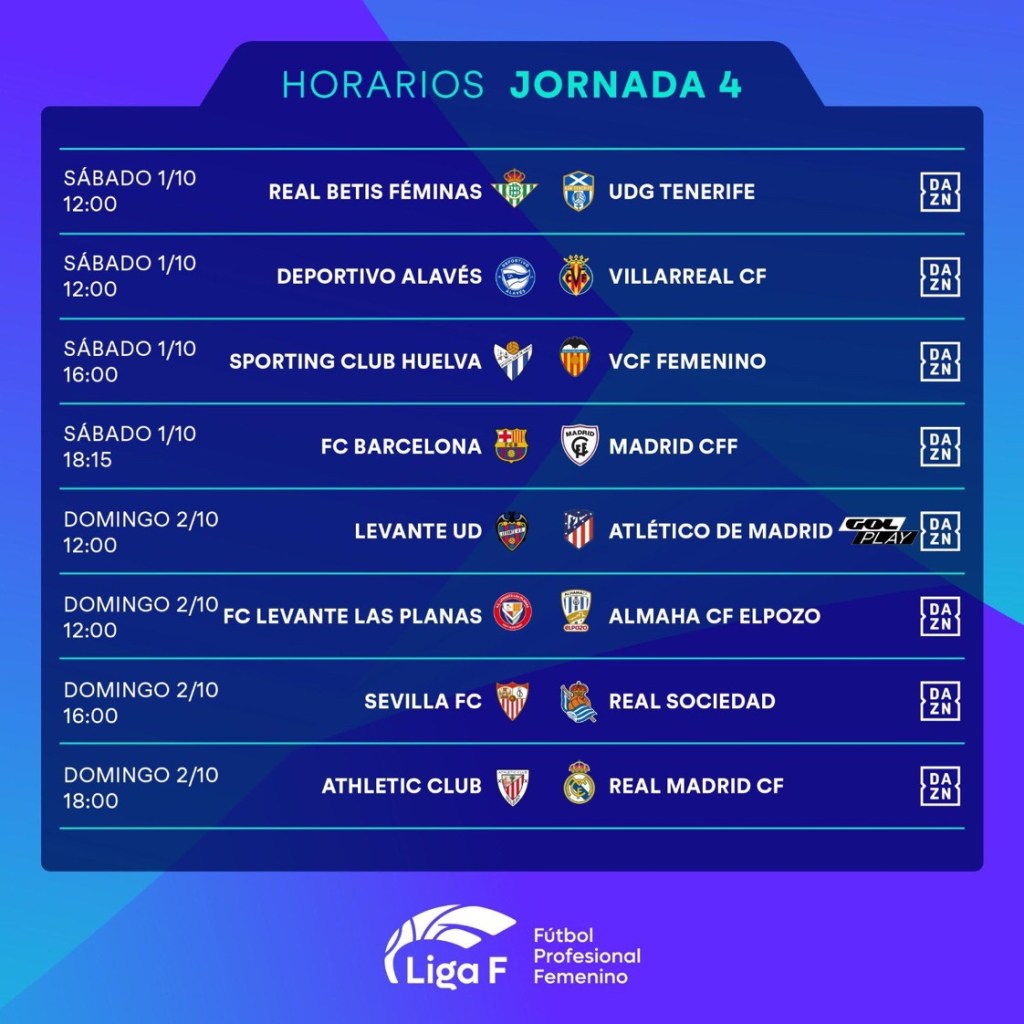 La nueva Liga Profesional de Fútbol Femenino, bautizada oficialmente como Liga F, ha querido anunciar a través de sus diferentes perfiles en las redes sociales cuál será la organización que habrán de seguir los compromisos ligueros que tendrán lugar entre el 1 y el 2 de octubre de 2022.