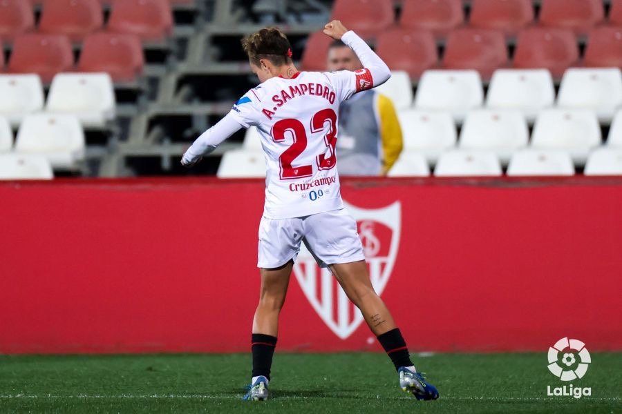 Amanda Sampedro, mito del Club Atlético de Madrid Femenino durante décadas y ahora una pieza clave en Nervión, asumió la responsabilidad de ejecutar y transformar el lanzamiento desde los once metros y tras engañar a la guardameta visitante con maestría, transformó la ejecución desde el punto fatídico y celebró el 3–1 a los 48 minutos y la “misión” de sacar algo positivo del Jesús Navas era ya harto compleja para el Madrid CFF.