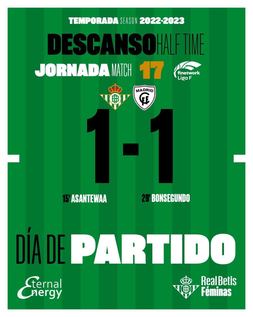 A partir de ahí, el Madrid CFF supo contemporizar el duelo con el marcador a su favor y dejó correr el cronómetro sin pasar apuros pese al arreón final del Real Betis y la contienda fue caminando hacia el final sin mayores sobresaltos.