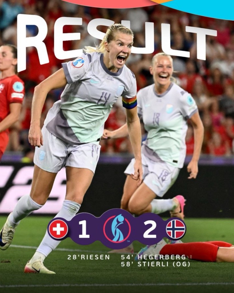 El gran saque de esquina de Vilde Bøe Risax fue rematado con un cabezazo inapelable por la capitana Ada Hegerberg. Y sin tiempo para levantarse, Suiza se vio por detrás en el marcado en apenas cuatro minutos cuando un centro desde la izquierda de Graham Hansen fue introducido en su propia portería por la defensa local Julia Stierli en su intento de despejar el balón era el 1-2 a los 58 de juego.