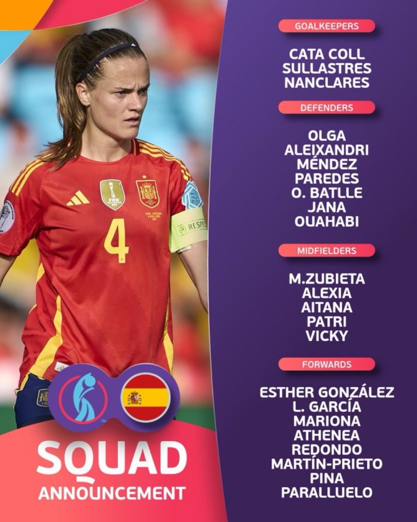Las 23 elegidas para la Eurocopa son: Cata Coll (Barcelona), Adriana Nanclares (Athletic Club) y Esther Sullastres (Sevilla); Ona Batlle (Barcelona), Jana Fernández (Barcelona), Irene Paredes (Barcelona), Laia Aleixandri (Manchester City *), María Méndez (Real Madrid), Olga Carmona (Real Madrid *) y Leila Ouahabi (Manchester City); Patri Guijarro (Barcelona), Aitana Bonmatí (Barcelona), Alexia Putellas (Barcelona), Vicky López (Barcelona) y Maite Zubieta (Athletic Club); Mariona Caldentey (Arsenal), Salma Paralluelo (Barcelona), Claudia Pina (Barcelona), Athenea del Castillo (Real Madrid), Alba Redondo (Real Madrid), Lucía García (Monterrey), Esther González (Gotham) y Cristina Martín-Prieto (Benfica).