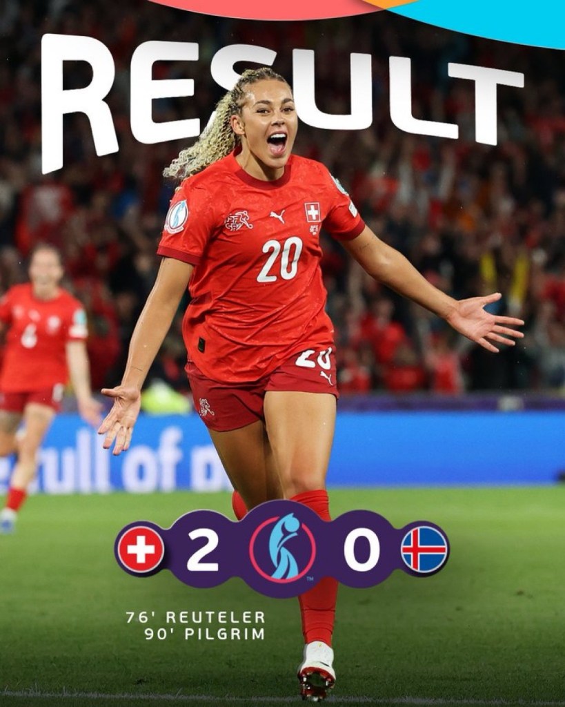 Este fue el gol que despertó a las helvéticas y hundió a las islandesas. Parecía que más que la remontada llegaría la sentencia. Wandeler pudo hacer el segundo, también Pilgrim que se encontró con el paradón de Rúnarsdóttir , hasta que en el añadido, en otra transición helvética Pilgrim recibió en la frontal, recortó y mandó el balón pegado al palo con extrema virulencia y el 2-0 fue inevitable para una selección nórdica que estaba recibiendo un castigo excesivo cuando el reloj deambulaba ya por el minuto 89 del enfrentamiento, era la guinda la del pastel, una sentencia en toda regla.