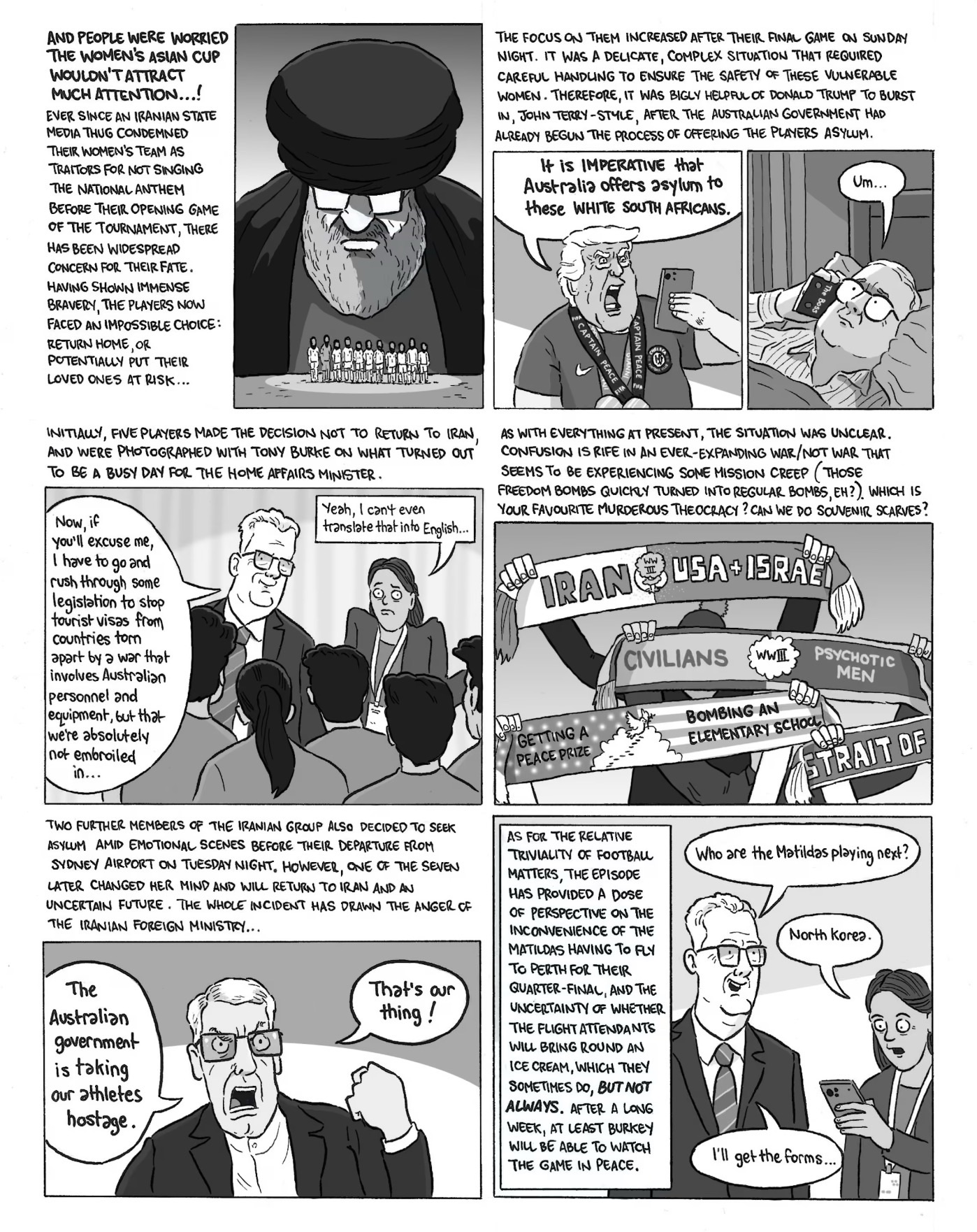 El fútbol femenino también tiene historias que trascienden el césped. El ilustrador David Squires volvió a demostrarlo con una de sus últimas viñetas, centrada en la situación de la Selección femenina de Irán durante la AFC Women’s Asian Cup 2026 en Australia.