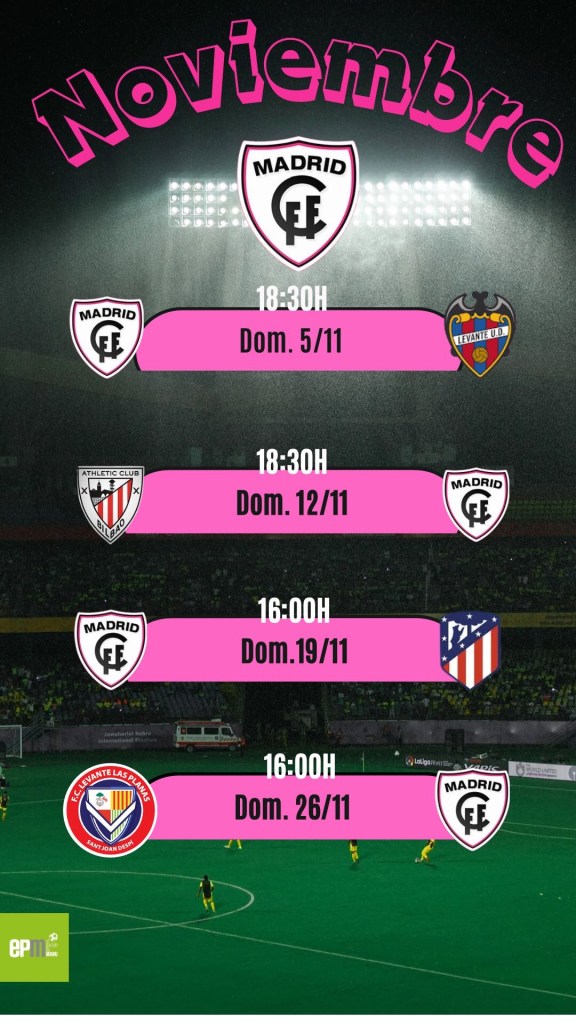 FfEn este mes de noviembre el calendario liguero del equipo que actúa como local en el Estadio Fernando Torres de Fuenlabrada es muy atractivo, léase, Madrid CFF vs Levante Unión Deportiva, Athletic Club vs Madrid CFF, el derbi, Madrid CFF vs Atlético de Madrid, y un Levante Las Planas vs Madrid CFF para cerrar el espectáculo.