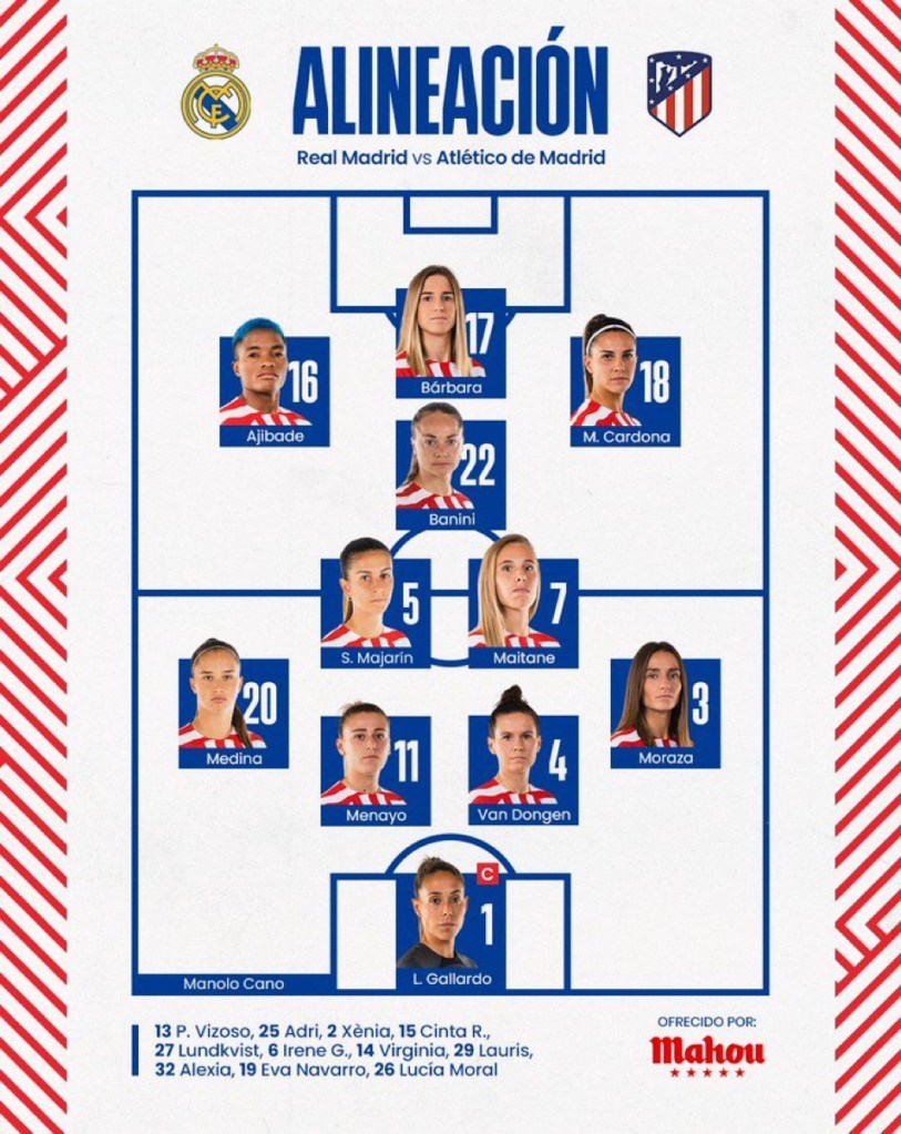 Atlético de Madrid: Lola, Moraza (Alexia, 77′), Van Dongen (Lundkvist, 67′), Majarín (Irene, 57′), Maitane, Menayo, Ajibade, Bárbara (Lucía Moral, 57′), Cardona (Eva Navarro, 57′), Medina y Banini.