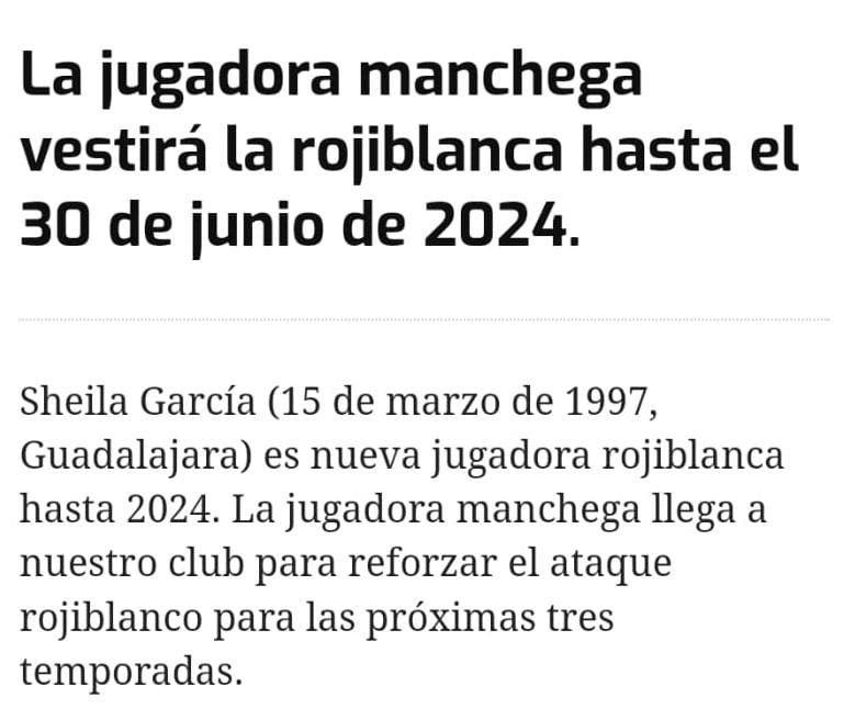 Si accedemos hoy en día a la página web del conjunto capitalino (https://www.atleticodemadrid.com/atm/atletico-de-madrid-femenino), vemos que el equipo de prensa ha modificado la fecha de expiración del vínculo contractual por una temporada, situándolo en el próximo 30dejuniode2024.