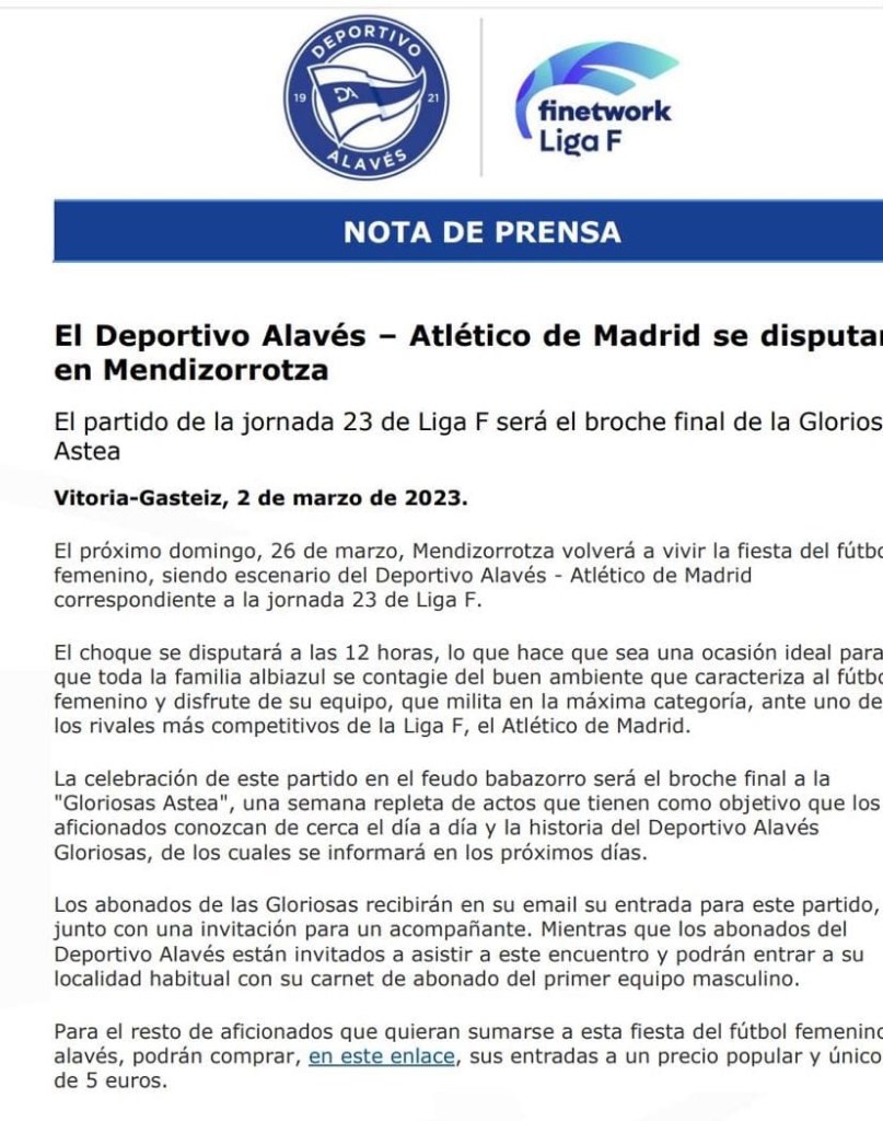 La LPFF anunció que el cara entre el Madrid Club de Fútbol Femenino y el Deportivo Alavés Gloriosas debía tener lugar en tercer lugar dentro de la vigésima jornada de la Primera División Femenina 2022-2023 y debe de desarrollarse el próximo sábado, 4 de marzo de 2023, de las 14:00 horario peninsular sobre el césped del Estadio Fernando Torres bajo la cobertura de la plataforma de pago de DAZN.