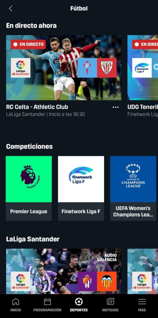 Una vez allí nos mostrará lo que está en emisión en ese momento, pero si bajamos un poco, hallaremos un letrero en blanco que se denomina “competiciones” y ya sólo tendremos que hacer click en Finetwork Liga F y acudir por último a la ventana “ponte al día” para gozar así de la Primera División Femenina sin estar sujetos a horarios ni fecha de retransmisión, al final somos nosotros los únicos que hemos de decidir lo que vamos a hacer con nuestro tiempo.