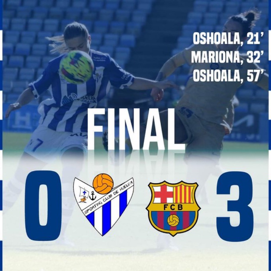 El paso de los minutos evidenciaba que las locales, pese a las desventaja, tenían otra actitud y dieron Tenían otra alegría las de Antonio Toledo, dos pasitos más alante que en la primera mitad, pero sin llegar con peligro a la meta de Sandra Paños. De hecho, las onubenses dejaban más espacios atrás. Corría el minuto 48 de juego cuando una nueva acción por la banda izquierda de Mariona Caldentey dio paso a un centro al área de la “9” que fue cazado por Oshoala de primeras dentro del área que le sirvió a la dorsal número “20” para instaurar el 0–3 en el luminoso que, a la postre, resultó ser definitivo cuando el reloj deambulaba por el minuto 57 del enfrentamiento.