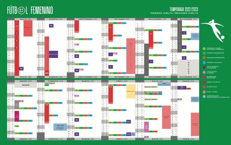 Además, la final de la Copa de la Reina 2023, de nuevo bajo el formato de “Final Four” se encargará prácticamente cerrará la temporada en cuanto a competiciones nacionales se refiere y tendrá lugar del 23 al 28 de mayo, justo en la semana posterior al final de la Primera División de Fútbol Femenino y coincidiendo con los partidos de vuelta de los playoff de ascenso de Primera Federación y los de ida de Segunda Federación.
