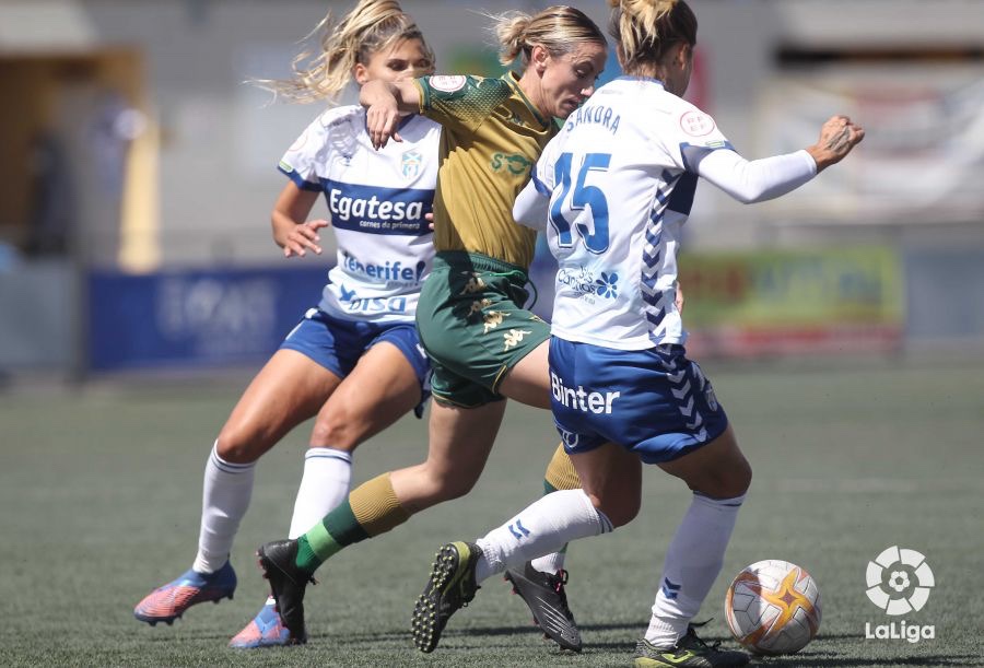 El partido tuvo un arranque muy favorable para las verdiblancas. En los compases iniciales el cuadro de Heliópolis que saltó más cómodo al verde que el conjunto tinerfeño y ejerció una presión en bloque alto con Ángela Sosa y Mari Paz Vilas trabajando mucho en pro de incomodar el fútbol directo que suelen utilizar eficientemente las pupilas de Francis Díaz y las ocasiones de gol brillaban por su ausencia.
